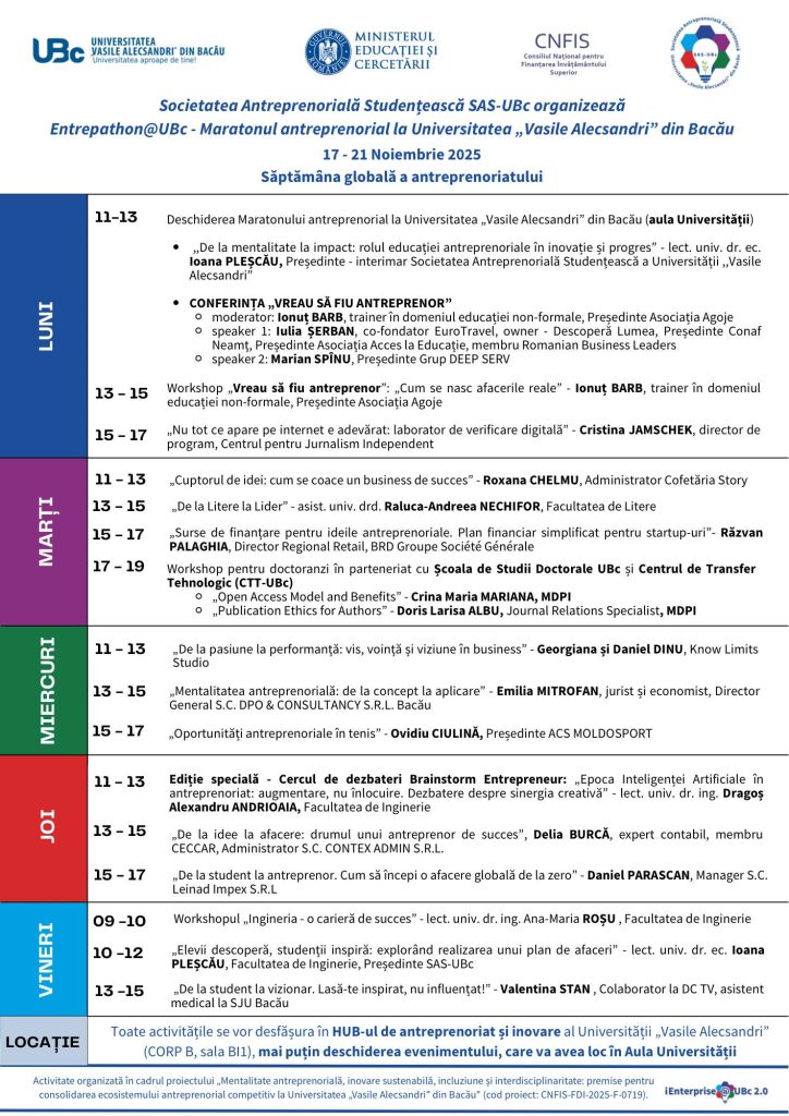 Și în acest an, celebrăm spiritul antreprenorial prin Entrepathon@UBc, un adevărat maraton al educației antreprenoriale, desfășurat la Universitatea „Vasile Alecsandri” din Bacău. 🚀