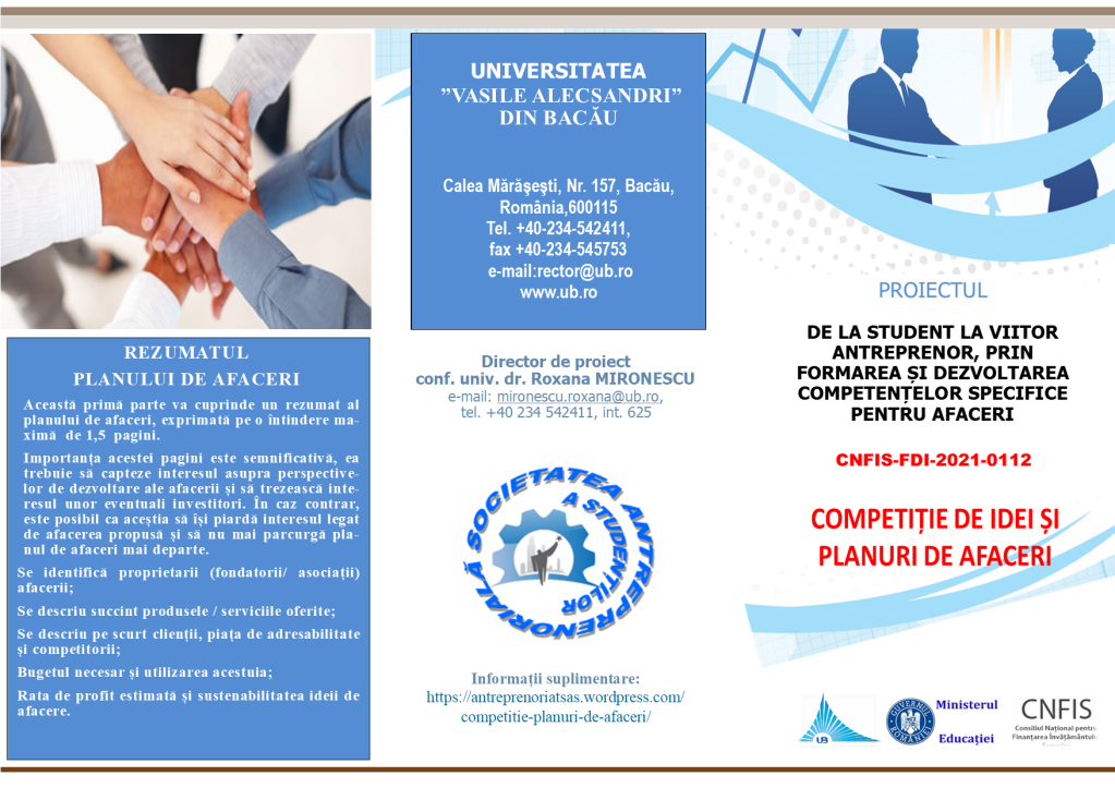 Începând cu data de 19 iulie 2021 se lansează o nouă competiție de planuri de afaceri. Informații suplimentare se pot afla la sediul SAS.