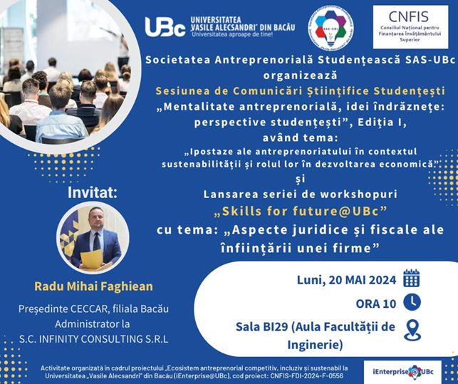 Luni, 20 Mai 2024, ora 10, în sala BI29 (Aula Facultății de Inginerie) va avea loc Sesiunea de Comunicări Științifice Studențești pe teme de antreprenoriat „Mentalitate antreprenorială, idei îndrăznețe: perspective studențești” în cadrul căreia vom lansa seria de workshopuri de formare pe teme de antreprenoriat „Skills for future@UBc”. Primul workshop din această serie va avea tema: „Aspecte juridice și fiscale ale înființării unei firme” și îl vom avea ca invitat pe Radu Mihai Faghiean, Președinte CECCAR, filiala Bacău și Administrator la S.C. INFINITY CONSULTING S.R.L.