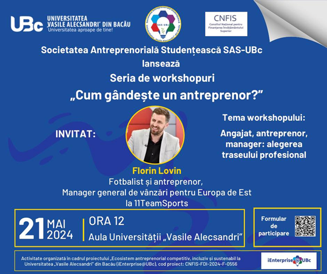 Marți, 21 Mai 2024, ora 12, în Aula Universității „Vasile Alecsandri” va avea loc lansarea seriei de workshopuri cu antreprenori, serie intitulată „Cum gândește un antreprenor?”. Invitatul primului workshop este Florin Lovin, fotbalist, antreprenor și manager general de vânzări pentru Europa de Est la 11TeamSports, care va aborda tema: „Angajat, antreprenor, manager: alegerea traseului profesional”. Studenții interesați de acest workshop sunt rugați să completeze formularul de înscriere accesând codul QR din afișul postat sau să acceseze următorul link: https://forms.office.com/e/AcPZCzsxmz?origin=lprLink