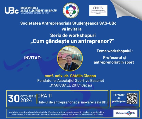 Vă așteptăm miercuri, 30.10.2024, ora 11, în Hub-ul de antreprenoriat și inovare al universității (Corp B, sala BI1)!