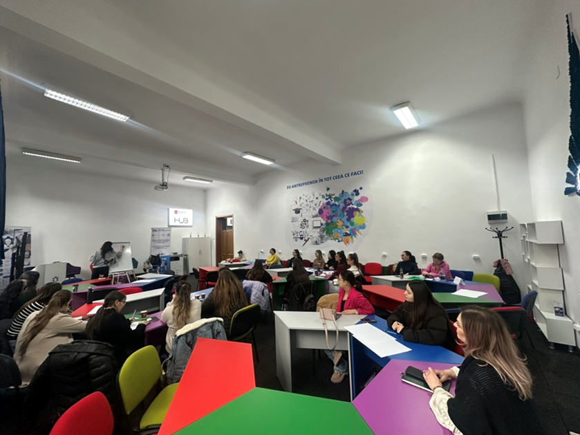 Cu sistemul modular al meselor pregătit pentru lucrul în echipe, Hub-ul de antreprenoriat și inovare a găzduit, astăzi, un nou workshop în cadrul proiectului “Simulated Enterprises in Food Industry at the “Vasile Alecsandri” University of Bacau” (SEiFI@UBc).